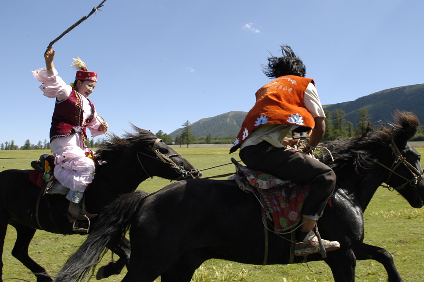哈薩克族喜聞樂見、世代相傳的體育娛樂活動(dòng)有很多,其中具有代表性的主要有姑娘追、叼羊、賽馬、摔跤、馬上摔跤、騎馬搶布、騎馬拾銀元、馬上角力、馬上射箭等饒有趣味的體育娛樂活動(dòng)。這些活動(dòng)一般都在喜慶節(jié)日上集體進(jìn)行,充分體現(xiàn)了哈薩克族勤勞勇敢、機(jī)智聰明、剽悍粗獷的民族特點(diǎn)。與此同時(shí),這些體育娛樂活動(dòng)也是哈薩克族世代相傳的強(qiáng)身健體的方式與手段,也是哈薩克族群眾喜聞樂見的傳統(tǒng)的民間體育娛樂活動(dòng)。
