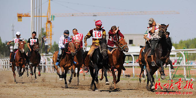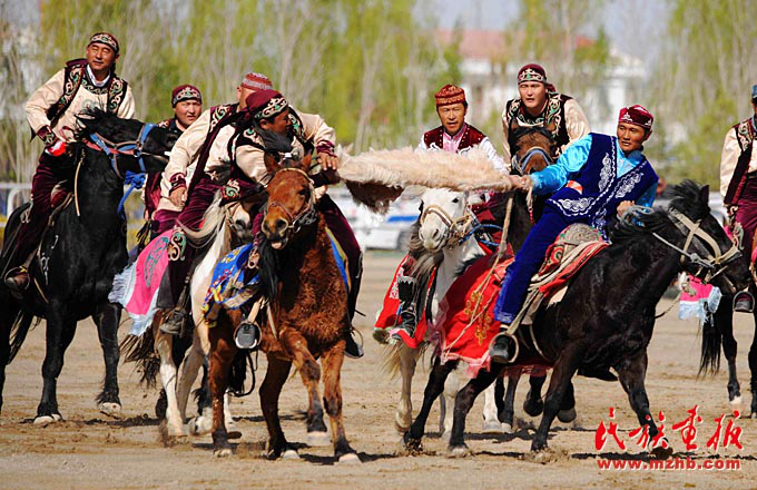 “叼羊”是哈薩克族一種力量和勇氣較量的馬背上的比賽。圖為阿克塞縣賽馬會上的叼羊比賽