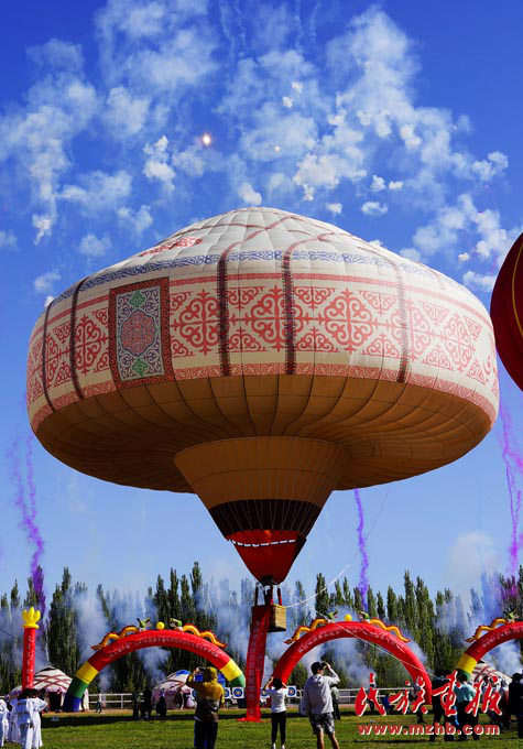 氈房是哈薩克族的傳統(tǒng)民居之一,是哈薩克族人游牧?xí)r居住的地方。圖中直徑長達(dá)21米、高23米、體積達(dá)2800立方米、通過世界紀(jì)錄協(xié)會認(rèn)證的這只阿克塞縣的旅游空中形象大使,是目前世上最大的哈薩克族氈房熱氣球