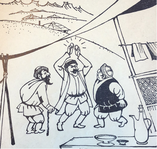 有一天,霍加納斯?fàn)栐诼飞仙⒉剑?tīng)見(jiàn)路旁飯館里鬧哄哄的。他好奇地走進(jìn)去一看,肥胖的掌柜正在打一個(gè)窮漢,窮漢的衣服都被撕破了,可是兇狠的胖掌柜還是邊打邊罵。