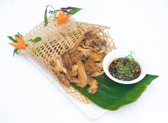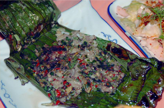 傣族傳統(tǒng)家常風味菜,特點是軟嫩鮮甜,原汁原味。制法是將鮮魚去鰓和內(nèi)臟,洗凈,將蔥花、姜末、蒜末、青椒末、青姜葉末、芫荽末、野花椒葉末、薄荷、茴香葉末、香茅草葉末、草果粉、味精、鹽、料酒拌制成餡,裝入魚腹,頭尾折攏,再用香茅草捆成十字,外面包以芭蕉葉,埋入木柴燒后的炭或熱灰中燒熟,取出去掉芭蕉葉和香茅草,裝盤即成。