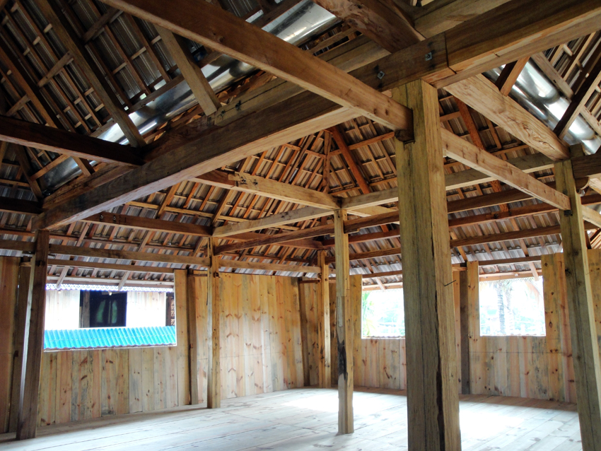 德宏瑞麗一帶的竹樓由“干欄”和平房兩部分組成,“干欄”是住房,平房是廚房?!案蓹凇倍酁殚L方形,下層架空,可堆放雜物。上層做橫向分割,成一間堂屋和數(shù)間臥室。堂屋中設(shè)有火塘,一般用于燒茶,在一角設(shè)有佛龕。堂屋外有開敞的前廊和曬臺。屋頂為歇山式,脊長,坡面平緩,外墻開窗,有的還是落地窗,墻與屋頂之間有縫隙,這些都加強(qiáng)了室內(nèi)空氣的流通,達(dá)到了室內(nèi)陰涼的效果。