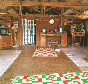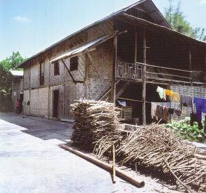 云南瑞麗的傣族民居。瑞麗的傣族民居是二層的竹樓,竹編外墻是利用竹皮正反面的紋理和光滑粗糙面編織的,從檐下垂直到底,均勻的縫隙透光通風(fēng),在強光照射下,其多變的幾何圖案更突出了工藝技巧和干欄式建筑的整體美感。屋面脊長,出檐短,大都用鍍鋅瓦楞鐵板替代草頂。樓層四壁以竹篾板封閉,開尺許小窗。外附短柱作下層重檐的斜撐,四周再加一圈矮柱,與墻面斜撐配。