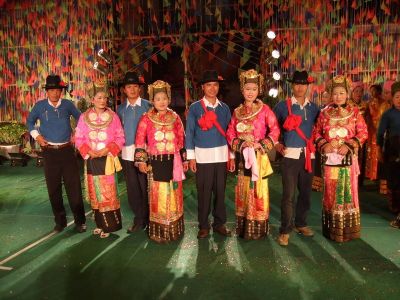 主婚人念完祝詞以后,新郎、新娘各在桌上揪下一團糯米飯,蘸點米酒、食鹽、舂鹽捧、芭蕉后擺在桌前。主婚人拿起一條長長的白線,從左至右纏在新娘、新郎的肩背,將白線兩端搭在“茂歡”之上,表示將一對新人的心拴在一起。然后再拿兩縷白線,分別纏在新郎、新娘的手腕上,祝愿新婚夫婦百年好合,無災無難。在座的長者也各拿兩縷白線,分別拴在新郎、新娘手上,邊拴線,邊念些祝愿詞。拴完線后,婚儀基本結束,婚宴開始,新郎新娘向賓客敬酒致意。