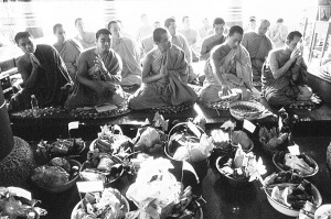 早晨8點(diǎn)多鐘,隨著緬寺大佛爺都比罕念誦起那古老的滴水詞經(jīng),賧奉儀式開(kāi)始了。我隨玉波一家坐在從家里帶來(lái)的涼席上。緬寺里已擺放不下人們送來(lái)賧奉的物品,只好放在緬寺的周?chē)?。人們用一根白線拴系著物品連著緬寺,以示并沒(méi)有遠(yuǎn)離緬寺和佛祖。