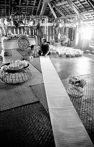 這時(shí),走來(lái)一個(gè)大佛爺和兩個(gè)老人,因?yàn)榉鹱娌粫?huì)開(kāi)口說(shuō)話,他們是來(lái)替佛祖給玉波念“薩拉帥”祝詞的。先由大佛爺念了一段《祝福經(jīng)》,給玉波滴了水,然后兩個(gè)老人打開(kāi)玉波那寬半尺、長(zhǎng)足有7米多的“薩拉帥”祝詞。玉金說(shuō),這祝詞是請(qǐng)曼降村的前大佛爺康朗寫(xiě)的(康朗:指佛爺還俗的人)。來(lái)倆個(gè)老人念,是考慮到可以換著念。玉波的奶奶也想到了玉波可能跪不習(xí)慣,就帶來(lái)了墊子,讓玉波或跪或坐,因?yàn)槟钔曜T~要兩三個(gè)小時(shí)。祝詞的內(nèi)容大致是這樣的:“我是一個(gè)在菩提樹(shù)下長(zhǎng)大的女孩,在佛祖的護(hù)蔭下,臉長(zhǎng)得像菩提樹(shù)葉一樣又嫩又青,身材像檳榔樹(shù)一樣苗條好看,心像金鹿一樣善良。當(dāng)我年滿12歲以后,人世間的喜樂(lè)情愛(ài),貧窮苦難就會(huì)來(lái)到我的面前。今天在父母的幫助下,我準(zhǔn)備了這些物品來(lái)賧給佛祖。我千祈禱萬(wàn)祈求,希望佛祖保佑我織布是行家,丈夫種田是能手。命里見(jiàn)火能親,遇水能溶。生的孩子女的長(zhǎng)得像一只蜜蜂,男的長(zhǎng)得像一頭水牛,用他們的勤勞贍養(yǎng)雙親。從小就聽(tīng)話,自幼就很乖。在母親的懷里不亂哭,在父親的背上不亂搓……”