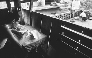 清晨,像毛毛細(xì)雨般的濃霧籠罩著整個(gè)傣寨,樹(shù)葉上的積霧如雨點(diǎn)“滴噠、滴噠”掉落在地上。隨著晨雞清脆的拍翅報(bào)曉聲,幢幢竹樓相繼亮起了燈。今天人們都要早起,要往緬寺里送賧奉的物品。玉波賧奉的物品太多,除了她的“薩拉帥”,還有她全家每人五份的賧奉物品。她的爺爺、奶奶、爸爸、媽媽加上我,搬送了兩趟才把物品送完。最后,在院子的門(mén)口上方留下一份,叫賧“帕巴結(jié)”,意思是留給死在外面不能進(jìn)緬寺的野鬼。