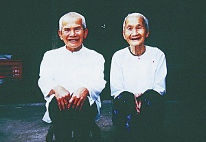 當(dāng)我來(lái)到時(shí),老人已經(jīng)入殮。我借機(jī)打量傣家這從不許外人參觀(guān)的、全家?guī)状硕妓诶镞叺纳衩氐呐P室。只見(jiàn)臥室是一個(gè)通廊,里邊一長(zhǎng)溜的帕墊(傣家人用來(lái)睡覺(jué)的棉被)都收裹起來(lái),棺材就橫放在臥室的中央,一個(gè)用竹子編成喇叭形狀的燈架里有一盞燃著的油燈;棺材的上面橫拉著一根筷子粗的尼龍繩,上面掛著一些筒裙衣物,想來(lái)可能是死者的;幾個(gè)男性老人圍著棺木而坐,往棺木上剪貼著白、綠、紫、黃幾種顏色的紙花。隨后而來(lái)的巖化告訴我說(shuō):“過(guò)世的老人已有82歲了。她生前為人隨和,很受寨子里晚輩的敬重。死前已臥床一個(gè)多星期,不吃不喝,也無(wú)疼痛跡象,正所謂天年已盡,壽終正寢?!睅r化還向我介紹說(shuō):按傣族的習(xí)慣,死者一咽氣,親友便立即用溫水為死者洗澡、梳頭、洗臉(洗臉時(shí),由下向上,以示區(qū)別于活人),穿上新的衣、褲、襪、鞋,包新頭帕。還要在死者嘴里放入一小砣金或銀,稱(chēng)作含口錢(qián)。然后用白布裹尸,將死者雙掌合十,放進(jìn)棺材里,用一塊方帕蓋臉。最后蓋上棺材,并通知寨子里的人。