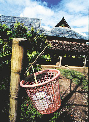 時(shí)常徜徉在傣族園里的我,一日忽然發(fā)現(xiàn)曼乍村每戶(hù)人家的院門(mén)上都掛了一個(gè)籮筐,筐里放了一個(gè)碗或是口缸大小的器皿,里面盛著些水,水里泡著一片有刺的葉子。每個(gè)從外面進(jìn)家的人,來(lái)到院門(mén)前都要拿起那片帶刺的葉子蘸一下器皿里的水,往自己頭上左右抖抖,動(dòng)作舉止頗為奇異。
