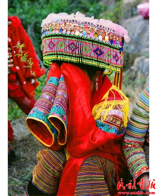 刮臉回來(lái)后,張正秀就由姐妹陪伴在閨房。屋外送親的酒席在熱鬧中開(kāi)席時(shí),舅母就回到閨房里為她洗臉洗腳,改換嫁衣。按傳統(tǒng)習(xí)俗,要把新娘用過(guò)的水潑灑在閨房的地上,以示吉利。新娘穿上由親人縫制的繡花衣裙,從頭到腳煥然一新。穿戴整齊后,新娘由伴娘陪同坐在閨房門(mén)旁的草地上接受祝福。女方家請(qǐng)的懂禮儀的阿巴莫(司儀)手持菜花和松針葉在堂屋敬女方家神,告訴家神姑娘要出嫁了,并給前一天夜里來(lái)新娘家領(lǐng)親的兩位娃拿扒(證婚人)挎上兩條交叉打結(jié)的紅布,表示娃拿扒已承諾為女方家領(lǐng)親。