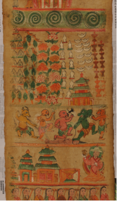 納西族東巴教的長幅布卷畫,通稱為“神路圖”,它是東巴教繪畫中的巨作。此類畫一般長10-20米,寬1尺左右,有“古代宗教繪畫第一長卷”之譽。文化內(nèi)涵異常豐富,在國際學(xué)術(shù)界被視為宗教繪畫一絕。如今,此畫已成稀有之物。很少見到尚留存民間的神路圖了?!吧衤贰敝鉃闁|巴為死者評斷、指點通往神地之路,把他們從地獄的煎熬中解脫超度出來,轉(zhuǎn)生為人,送至神靈之地。在納西族的喪葬和超度亡靈儀式上,根據(jù)神路圖導(dǎo)引死者靈魂進(jìn)入新的生命場是一件極為重要的大事。到時,要把神路圖展開,眾東巴站于圖旁依次詠誦8冊《神路圖經(jīng)》,為死者評斷路徑,導(dǎo)引亡靈穿越鬼地;擺脫惡鬼的種種折磨。在納西族實行傳統(tǒng)安葬習(xí)俗時,要在安葬場鋪開神路圖,把圖上的鬼地部分朝著死者頭部,向東北方向鋪開。往東北方向鋪的意思是死者靈魂將回歸東北方向的納西遠(yuǎn)祖之地。把死者靈魂送到“祖先之地”是納西族的古代民俗。各地納西族都有十分詳細(xì)的送魂路線,靈魂返祖地必經(jīng)的每一個地名都在口傳和寫于東巴經(jīng)的送魂路線中標(biāo)出。其畫面所繪鬼神人三界有數(shù)百個人神鬼獸的形象和很多具有宗教象征意義的物象,有佛像、神像、各種動物神,七八十個奇禽異獸以及東巴跳神的舞蹈布局,畫卷內(nèi)容以靈魂不滅,因果報應(yīng),生死輪回等佛教信條為指導(dǎo),用連續(xù)性和富有戲劇性的畫面表現(xiàn)人死后亡魂不滅。