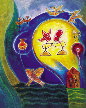 和向東: 東巴文化集納了積淀千年的納西文明, 東巴文字是東巴文化的靈魂。而它們?cè)跂|巴文化中的體現(xiàn),首先便是東巴教這種原始宗教,創(chuàng)造了圖畫象形文字來書寫一系列的經(jīng)文典籍、神話、詩詞,其中涉及生命的創(chuàng)造觀、世界緣起觀、生死觀、自然生態(tài)觀、天文觀、地理觀念等。當(dāng)時(shí)的納西族人和東巴們按照文化生活的需要,創(chuàng)造并繪畫出1400多個(gè)單字,當(dāng)中有的代表一事一物,有的表示一段故事,還有共同應(yīng)用的情況。沒有學(xué)術(shù)理論依據(jù),也沒有良好的繪畫基礎(chǔ)訓(xùn)練,他們純粹依照想象力,大自然賜予的財(cái)富——日、月、星、辰等的啟示,從而創(chuàng)造出一套與當(dāng)時(shí)社會(huì)同步需要的符號(hào)圖案——圖畫象形文字。時(shí)至今日,它們?nèi)匀贿€活著,老東巴們和一些研究人員仍能對(duì)其書寫朗誦,令世人驚訝,也成為人類古代生活的活字典。東巴圖畫象形文字是一種仍在使用的古老的文字符號(hào),被稱為活著的象形文字,是人類發(fā)展史的原始圖畫。由此看出東巴文字本身就具有很高的藝術(shù)價(jià)值,每一個(gè)東巴文字都是很美的一幅畫,直接將它作為繪畫元素就不難理解了。所以我就回避不了去學(xué)習(xí)東巴文字,當(dāng)然只是從我創(chuàng)作需要出發(fā)去學(xué)習(xí),還談不上研究。