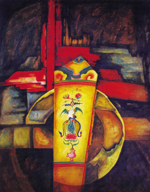 我以前所結(jié)識(shí)的一批納西族畫家差不多都是上世紀(jì)四五十年代出生的,他們大多接受過美院等高等藝術(shù)院校的教育,具有堅(jiān)實(shí)的繪畫功力,有相同的美學(xué)見解和共同的探索形成的藝術(shù)追求。它一出現(xiàn)就以其獨(dú)特的美學(xué)傾向和特殊的藝術(shù)魅力引起世人的關(guān)注。而和向東是上世紀(jì)70年代出生的青年畫家,他原來就讀于浙江大學(xué)的藝術(shù)設(shè)計(jì)專業(yè),只因迷上美術(shù)學(xué)理論而走上了創(chuàng)作之路,沒有學(xué)院派的背景。他的家鄉(xiāng)云南麗江現(xiàn)在已是聲名鵲起,納西族東巴文化作為世界記憶遺產(chǎn)已聞名海內(nèi)外。作為年輕一代的納西族畫家又該怎么表現(xiàn)東巴文化呢?這個(gè)學(xué)藝術(shù)設(shè)計(jì)的年輕人以設(shè)計(jì)師的獨(dú)特眼光和思維,一開始就與“現(xiàn)代東巴繪畫派”的中年畫家群體拉開了距離。其作品在保留古老的東巴繪畫藝術(shù)的基礎(chǔ)上,在作品中運(yùn)用書寫東巴經(jīng)卷的各種形象和文字符號(hào)。用當(dāng)代人的思維觀念和審美意識(shí),運(yùn)用油畫的技法來表達(dá)。畫面大多用平面設(shè)計(jì)的構(gòu)成原理,以裝飾性的、形式感極強(qiáng)的、既寫實(shí)又抽象的手法表現(xiàn)出原汁原味的納西文化。即使拋開作品主題內(nèi)涵,依然可以從他的作品里感受到一種神秘、古樸、深沉的歷史基調(diào)。因4年前他的創(chuàng)作是在平面設(shè)計(jì)為主的業(yè)余時(shí)間里完成的,而真正投入精力進(jìn)行專業(yè)創(chuàng)作是近兩年的事,因此,他現(xiàn)在處于學(xué)習(xí)、吸收、探索創(chuàng)作的過程中。
