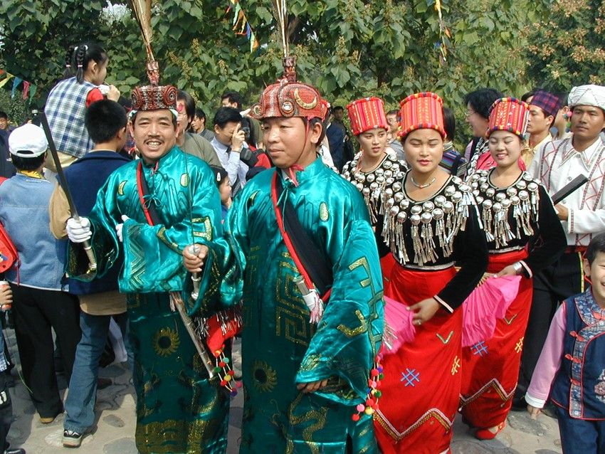 目瑙節(jié):又稱“總戈”,景頗語音譯,意思是“大伙跳舞”。目瑙節(jié)是景頗族最盛大的傳統(tǒng)節(jié)日,一般于每年農(nóng)歷正月十五以后的九天內(nèi)擇雙日舉行,節(jié)期三至五天不等。目瑙作為一種大型的群眾性歌舞活動,由來已久,歷史上,每逢豐年,出征、凱旋、婚姻嫁娶、敬祭鬼神等重要活動,均要跳“目瑙”。景頗族的“目瑙縱歌”原來是一種融宗教和文化習(xí)俗為一體的傳統(tǒng)慶典。隨著社會的發(fā)展,逐漸演化為各種不同類別的“目瑙”。大致有以下幾種:①“歲目瑙”,家庭財源茂盛,人丁興旺時舉行;②“布當(dāng)目瑙”,征戰(zhàn)取得勝利時舉行;③“貢冉目瑙”,同胞兄弟分家自立門戶時舉行;④“騰肯目瑙”,新建房屋住所落成時舉行;⑤“空然目瑙”貴族家娶親辦婚禮時舉行;⑥“達(dá)如目瑙”,出征時舉行;⑦“昔目瑙”,有名望的長者去世送葬時舉行;⑧“柱目瑙”,祭奠“木代”神時舉行。不同類別的“目瑙”都有特定的內(nèi)容和表現(xiàn)形式,但有一個共同點就是整個過程都是由“瑙雙”(領(lǐng)舞)隊和“瑙巴”(表演)隊組成的舞隊來表現(xiàn)和完成的。每逢目瑙節(jié)日,村村寨寨的景頗人身著節(jié)日盛裝,紛紛從四面八方涌入目瑙廣場。廣場上人山人海,氣氛熱烈歡快而不失莊嚴(yán)古樸的特色。廣場中央高豎著四根長約4米的目瑙柱,亦稱雌雄柱,中間兩根為陰,外面兩根為陽,上面皆繪有精美而富有象征意義的圖案:右邊柱上往往繪以蕨菜花紋,象征團結(jié)奮進(jìn);左邊常畫回紋構(gòu)成若干個四方形,并涂以不同顏色,表示景頗族的遷徙路線;中間兩根柱子之間,交叉著兩把長刀,為景頗民族驍勇強悍、堅強剛毅性格的具體標(biāo)志。目瑙柱的左側(cè)立著一個方形架子,上層是吹嗩吶的座位;前面掛著一個兩米長的大皮鼓和一面直徑一米多的大芒鑼,供跳舞時伴奏用。廣場四周用竹籬笆圍起,目的是為了防止野鬼的侵入和牲畜的干擾。舞蹈開始時,鼓樂齊鳴,由兩位德高望重且又熟悉目瑙舞路線的老人身穿大龍袍,頭戴飾有孔雀、野雞羽毛和野豬牙齒的目腦帽,手持長刀領(lǐng)頭,后面跟著背銅炮和持長刀的隊伍,婦女們拿著扇子或彩帕跟在最后,邊歌邊舞,熱鬧非凡。參舞者少則百多人,多則幾千人,從清晨到日暮,以日暮到清晨,通宵達(dá)旦,其間舞者跳累時可自動退場小歇片刻,然后繼續(xù)登場舞蹈?!澳胯Эv歌”作為一個民族的傳統(tǒng)活動發(fā)展至今,宗教色彩和類別已日益淡化,它已成為景頗族約定俗成的傳統(tǒng)節(jié)日,統(tǒng)稱為“統(tǒng)肯(傳統(tǒng))目瑙”并賦予了新的內(nèi)涵,其內(nèi)容和形式都是展示一個民族的傳統(tǒng)文化,反映今天的新生活和對未來的美好向往。