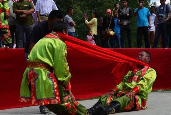 頸力賽和扳棍一樣,也是達(dá)斡爾族傳統(tǒng)的競技項(xiàng)目之一,在達(dá)斡爾族之間十分流行。頸力賽的比賽方式和扳棍相似,比賽雙方需要端坐在平地上,蹬直雙腿,腳掌相對(duì),雙手叉腰或放在腿上,用布腰帶套在雙方脖頸后部。當(dāng)裁判員聲響后,比賽雙方需要互相用脖頸力拉扯對(duì)方,哪一方被拉起或屈膝歪倒,就輸?shù)袅吮荣悺?/p>