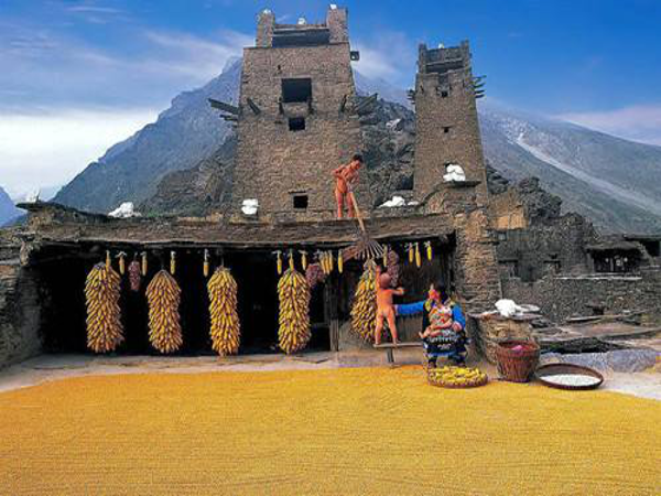 羌族的建筑很有特色。因為羌族聚居區(qū)位于青藏高原的東部邊緣的岷江上游地區(qū),這里山脈重重,地勢陡峭。羌寨一般建在高半山,因而羌族被稱為“云朵中的民族”。