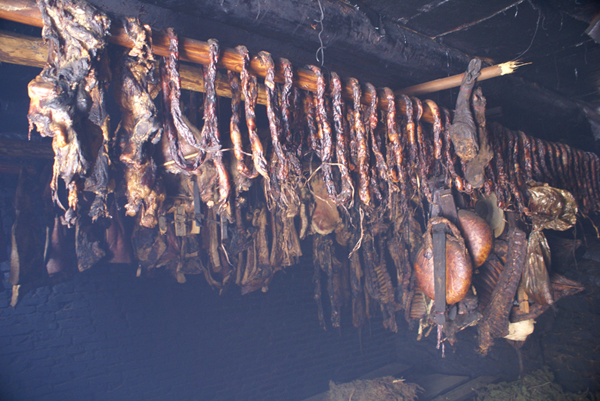 羌族通常一年宰殺一次豬,所以除了剛剛宰殺的那幾天能吃到鮮肉外,平時很少食用。每年冬月殺豬后均將豬肉切割、抹鹽、煙熏,腌制成臘肉。豬油也在抹鹽后,用兩個木夾夾壓成餅狀,隨吃隨煉。同時也取部分瘦肉切碎,拌上作料,灌入洗凈的豬小腸內(nèi)制成香腸。羌族還常把新鮮的豬骨頭砍成小塊,然后抹上鹽、花椒、姜、蒜、蔥等,放進(jìn)豬的胃囊里,扎緊、風(fēng)干,掛在火塘上用煙熏,制成豬肚骨頭,久存不壞。