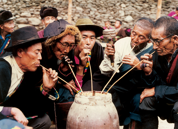 男女老少皆喜歡家釀的咂酒。青稞、大麥或玉米釀成酒,封于壇中,用時啟封,注入開水,插上竹管,輪流吸咂,邊飲邊加清水,直至味淡。普遍吸蘭花煙。