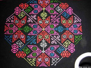 刺繡針法主要有鎖繡、平針繡、參針繡、壓針繡和眉毛花、納紗繡、補花繡、十字繡、編針繡、牽花繡、緝針繡、云子花等。鎖繡針法采用繡線環(huán)圈鎖套而成,即線線成環(huán)、針針套扣,落針在起針旁,最后繡成的紋路效果如鎖鏈結構,因而得名鎖繡。羌族鎖繡發(fā)展成為各式針法,并成為羌族刺繡的重要針法。鎖繡主要運用于圍腰上的裝飾紋樣,平針繡又稱“齊針繡”,是繼鎖繡之后另一種古老而傳統(tǒng)的針法。平針繡的繡線排列整齊均勻,不露地、不重疊,以繡跡的絲理顯現(xiàn)紋飾的質感,繡紋具有閃光緞面的效果,多用于小塊面的刺繡。參針繡又稱“套針繡”,是在平繡的基礎上增加深淺變化,以表現(xiàn)花、葉等紋樣的明暗,使大面積的紋樣層次豐富而有立體感。在平繡和參針繡的基礎上,羌族婦女創(chuàng)造了壓針繡的針法,她們又稱之為“撇花”。在繡一針長線后,又用一針短線壓在原長線上,并確保每繡一針長線后均在同一位置壓上短線,如編籬笆一般,紋樣邊緣整齊,紋樣內的繡線交錯有致,產(chǎn)生富有變化的視覺效果。穿花繡、九針繡,多用于頭帕以及飄帶上。納紗繡的針法是在素色面料上按經(jīng)緯紗線交織的孔進行刺繡,并沿著一個方向施針,如垂直的經(jīng)線方向或水平的緯線方向,通過露出面料地色而形成花紋。補花繡又稱貼花繡、貼布繡。羌族婦女稱之為“拼花”,即將色布拼接后形成花紋。補花繡制作簡便,紋樣簡潔大氣,裝飾效果強烈。制作時,將剪好的色布貼于服裝、鞋面所需要裝飾的部位,然后用鎖扣繡、結邊繡或緝針繡的針法固定色布。十字繡又名挑花、架花、數(shù)紗繡,在羌繡中占有重要地位,十字繡繡品種類多、數(shù)量大、表現(xiàn)的內容非常豐富。羌族十字繡,既有嚴密的構圖,又有豐富的內容、對比的色彩和精彩的紋樣,還有精煉而靈活的針法。類似十字繡的刺繡,繡線相互編織、交錯、重疊,繡線排列、交織勻稱,交錯的繡線如同編織的網(wǎng),可形成各種塊面和線條。牽花繡又稱“纖花”、“兩面花”、“里面花”,即采用單根繡線,繡針按面料的經(jīng)緯線走向,有規(guī)律地來回穿刺,形成上針、下針、順針、回針,繡出的圖案在面料的里和面均呈現(xiàn)規(guī)則的幾何形花紋。緝針繡以回針法運針,即針腳頭尾相接,因此民間又稱為“倒鉤針”。緝針繡要求針腳長短均勻整齊,繡紋自然流暢,此針法多用于補花繡,將補繡的布片固定在裝飾部位。云子花又稱“云云花”,多用于云云鞋鞋面上補花圖案的裝飾。因此,“羌族刺繡既繼承了傳統(tǒng)針法豐富而又嚴謹?shù)奶攸c,又體現(xiàn)了本民族刺繡針法的靈活性與多樣性。