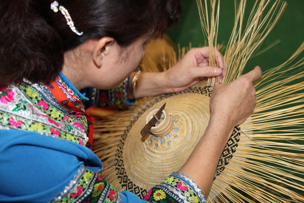 三角鉤鋤是毛南族特有的生產(chǎn)工具,毛南語叫“拱”。它小巧輕便,適合在雞窩地里中耕鋤草,又用于點種黃豆。種黃豆還有一種木制的“點穴錘”,用8寸到1尺長的金剛木削成圓桿,形如搟面杖,中間插一木柄,手握木柄在泥土里一錘,就成一個如雞蛋形的坑,即可放入黃豆,蓋上草木灰。這種“點穴錘”一錘一穴,工效很高,是種黃豆的最佳農(nóng)具。此外還有禾剪、割煙刀等(圖為毛南族織錦)。