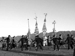 登窩羅時,領唱的人在前,這人叫“稍干”。其他人雙手叉腰,跟著稍干唱。邊唱邊大蹲大跳,一會兒背對背,一會兒面對面。春節(jié)圍著窩羅牌坊跳,平時圍著一張擺滿煙酒茶果的桌子跳,意思是圍著太陽、月亮轉(zhuǎn)。