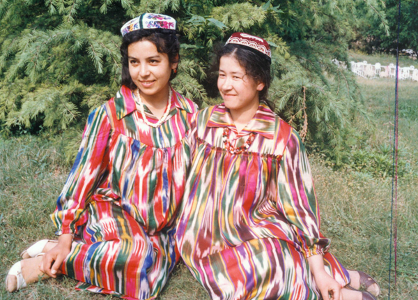 烏孜別克族女性喜愛穿連衣花裙,開領(lǐng),寬大多褶,不束腰帶。上衣比較短,只及大腿部,無領(lǐng)、無袖、對(duì)襟,下擺的正中和正面兩邊都開衩,形成兩片寬帶。襟和寬帶的邊都繡花。出門時(shí)還要穿斗篷、蒙面紗,從頭到腳都不能外露。