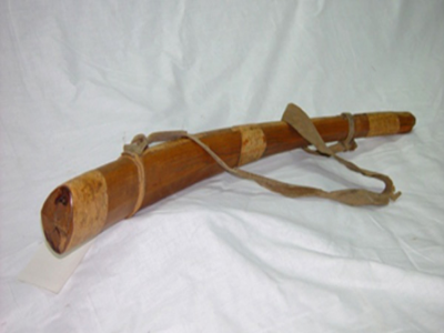 鄂溫克族牛角形帶箍木質(zhì)鹿哨,長(zhǎng)71厘米,紅松木質(zhì)地,1946年制作,鄂溫克族傳統(tǒng)擬聲狩獵工具,也作為樂(lè)器。征集于內(nèi)蒙古自治區(qū)喀爾古納左旗,藏于民族文化宮博物館。鹿哨是中國(guó)北方及東北亞狩獵經(jīng)濟(jì)文化類型的重要實(shí)物遺存,有鮮明民族與地域特色。