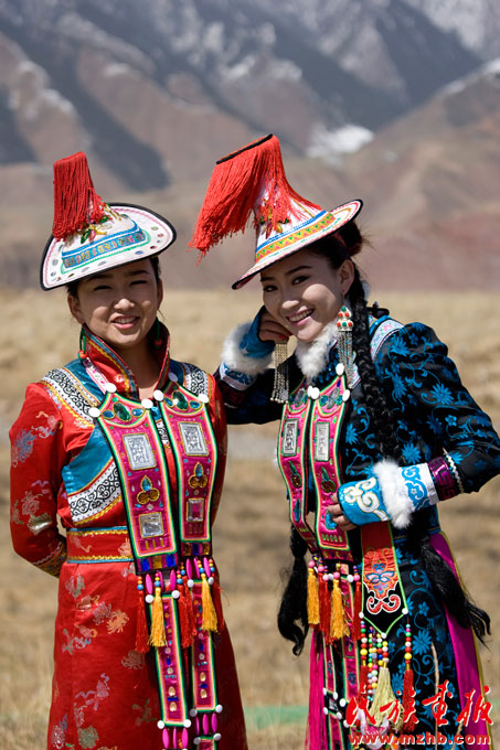 帽子是姑娘和已婚婦女的區(qū)別標志。姑娘不戴帽子,前額戴“沙日達什戈”。這是一條寬約三寸長約一尺,下邊緣用紅色或白色珊瑚小珠穿縫許多珠穗的紅色布帶。已婚婦女身穿高領偏襟長袍,一般由綢、緞、布、褐、皮料縫制。衣領高齊耳根,袍子一般以綠、藍色為主,但也有深紅、紫紅等顏色。袍子下擺兩邊開衩,衣袖口至肘部用各色織錦緞、彩綢、彩緞花邊一圈圈縫綴裝飾。腰系腰帶(裕固族也叫“胡兒”,即系腰),主要是桃紅色或綠色,長袍上面罩一件高領偏襟坎肩,但也有無領偏襟坎肩。