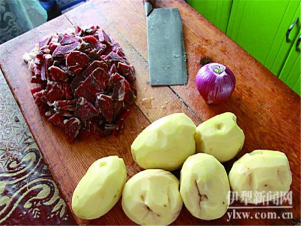 拜列西的做法有很多種,其中以用羊肉、洋蔥、土豆或南瓜為主要食材的伊提拜列西(肉拜列西)和以蘋果為食材的阿勒瑪拜列西(蘋果拜列西)為主。羊肉切薄片,土豆切小方塊,洋蔥切丁,倒在一起,擱置一旁,開始和面。和面是制作拜列西過程中一項至關重要的環(huán)節(jié),面和得好壞直接會影響到烤出來的拜列西的美觀程度和口感的酥脆程度。