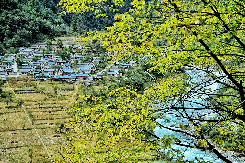 熊當(dāng)村遠(yuǎn)眺。熊當(dāng)村是獨龍江鄉(xiāng)最北的村子,與西藏接壤,如今已完成了安居重建