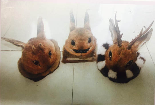 在鄂倫春族內(nèi),男人一般佩戴角長的狍角帽,女人和兒童佩戴無角或小角的狍角帽。所戴狍角帽均有補花繡出的狍子雙眼。兒童所戴的帽子會由補花繡出的鼻子和嘴等造型,生動形象。但現(xiàn)今的兒童帽上一般不會配有垂飾的紅穗,只用松緊皮筋釘于帽檐的左右兩側(cè),方便兒童戴帽子。制作兒童狍角帽的材料為春季的小狍頭皮,這一時期的袍子耳朵大,角剛露出頭頂,毛茸茸的,整個頭型看起來很稚氣,既暖和又美觀,所以鄂倫春兒童戴上這種帽子就要比成年人顯得活潑、可愛。而且造型更加逼真。