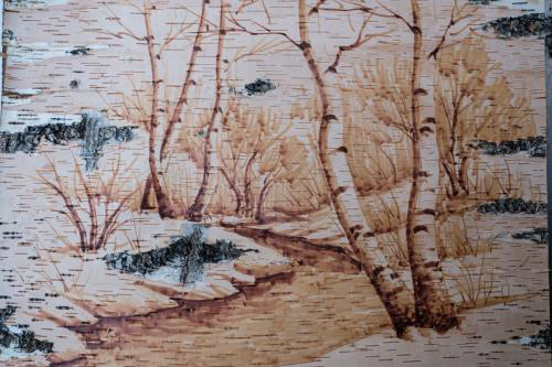 在制作樺樹皮畫之前,要先對(duì)樺樹皮進(jìn)行剝離、儲(chǔ)存和處理,每年陰歷5~6月份是剝采樺樹皮的最好時(shí)節(jié),因?yàn)榇藭r(shí)的樺樹正處灌漿期,樺樹皮與樹干之間充滿水分,樺樹皮最易剝落而不又不會(huì)傷及樹干。剝下來的樺樹皮因自然特性,剝下來就是呈表面在外,內(nèi)面朝里的卷曲狀態(tài),但如果任由這種狀態(tài)保存,作畫時(shí)就不能保證畫面平展了。所以,樺樹皮從剝落開始就要反自然狀態(tài),使表面朝里、內(nèi)面朝外卷捆。人們?cè)诙鞛榱烁帽3謽鍢淦さ娜彳浂?,?huì)對(duì)其用熱水進(jìn)行漂洗。一般在春、夏、秋季三季,漂洗過程就沒有必要了。樺樹皮畫的工藝流程大致為:選材——固定背板——揭皮——碳化繪制——題詞加印——涂油——表框。樺樹皮畫用的不是樺樹皮內(nèi)里,而是表里。由于樹皮表面粗糙,呈自然形態(tài),要進(jìn)行創(chuàng)作,就必須揭去表皮,并通過碳化過程進(jìn)行作畫。完成畫作后,為了是畫面光滑,尚需擦油。在樺樹皮畫制作過程中運(yùn)用到三種制作技術(shù):揭皮技術(shù)、碳化技術(shù)和涂油技術(shù)。