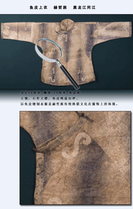 赫哲族的魚皮衣歷史久遠(yuǎn)。我國古代文獻(xiàn)《山海經(jīng)》第九卷《海外東經(jīng)》中便有“玄股之國,在其(黑齒)北,其為人衣魚食鷗” 的記載?!耙卖~”西晉學(xué)者郭璞解釋為“以魚皮為衣也?!闭f明早在兩千多年前,赫哲族的先民就已使用魚皮做衣服了。另據(jù)密山新開流新石器時代遺址中出土的魚叉及骨針,證明赫哲族的先民捕魚和縫制魚皮衣有數(shù)千年歷史了。清代張晉彥的《寧古塔山水記》有:“魚皮部落,食魚為生,不種五谷,以魚皮為衣,暖如牛皮”的記載?!痘是迓氊晥D》記載:“赫哲衣服多用魚皮而緣以色布,邊綴銅鈴,亦與鎧甲相似。”另外,地方志書對此也多有記載??梢?,赫哲族制作和穿著魚皮衣是真實(shí)而久遠(yuǎn)的。
