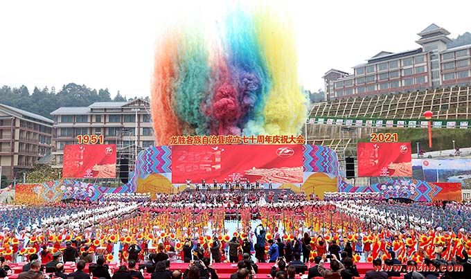 各民族同胞身著盛裝、歡聚一堂,通過民族風情展示、龍獅展演、文藝表演、跳民族團結(jié)舞等活動歡慶縣慶,展示了龍勝民族團結(jié)進步事業(yè)全新風貌與經(jīng)濟社會發(fā)展成果,各族人民脫貧致富的幸福感,以及各民族親如一家、共同團結(jié)奮斗、共同繁榮發(fā)展的新氣象。