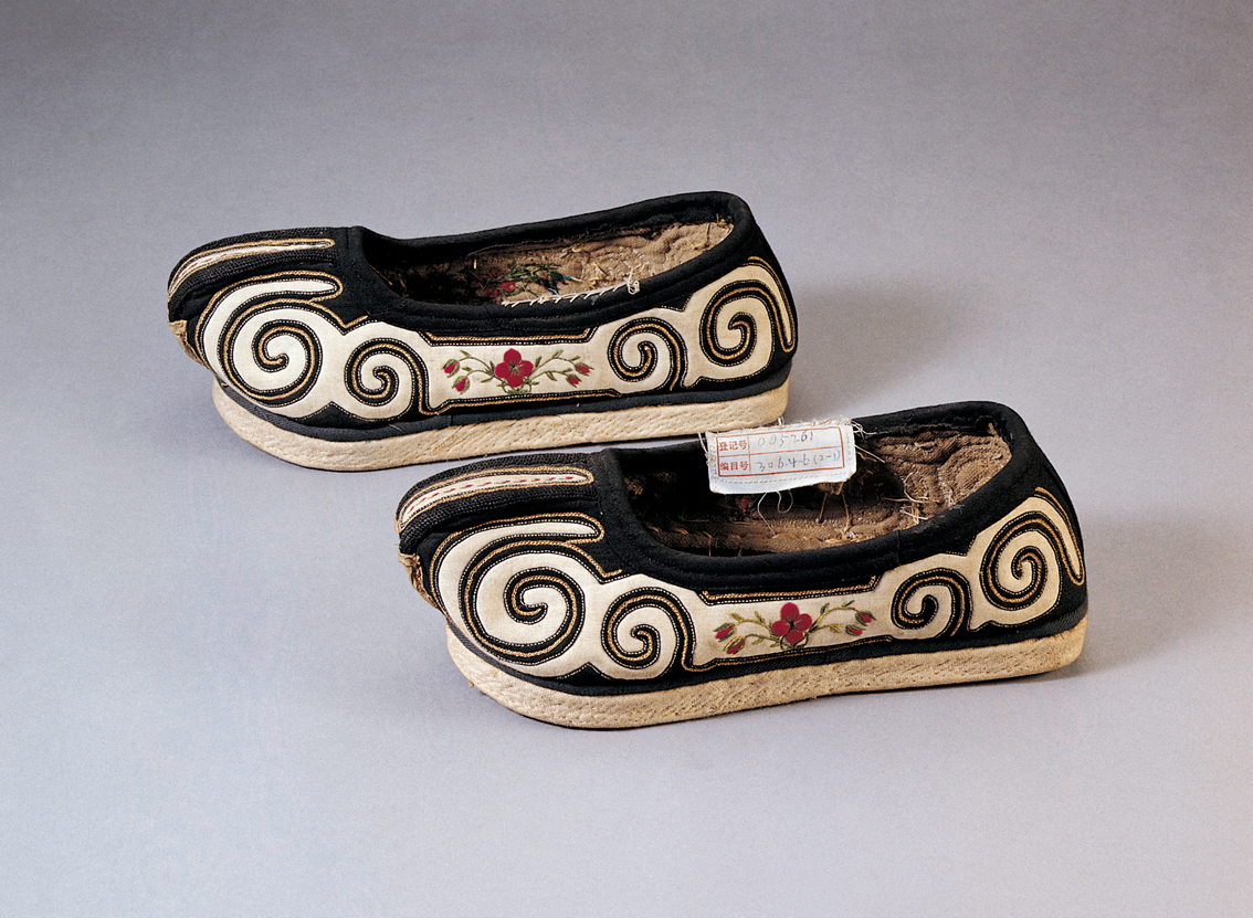 土族民國時(shí)期云紋雙梁繡花男布鞋,中央民族大學(xué)民族博物館館藏