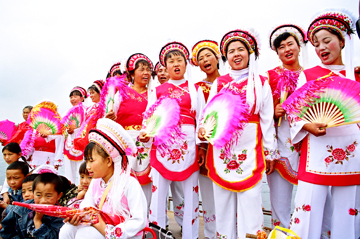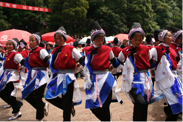 以大理市為主要代表的洱濱區(qū)白族服飾。如周城、喜洲、挖色等白族服飾,他們世代伴水而居,生活環(huán)境十分優(yōu)越,服飾給人一種清新明快的感覺。在很大程度上折射出這種環(huán)境的優(yōu)越性,周城村白族男服飾過去的穿著較為復雜,纏白布包頭,上衣穿立領對襟布紐衣,俗稱“三滴水”,最里的一件穿白色、中間一件穿藍色、最外一件穿黑色或是藏青色的外衣,三件衣服都是敞開著,露出內穿的兜肚,外穿一件麂皮或山羊皮的領褂,下穿白或藍色大襠褲,腳穿布底剪口鞋。肩掛繡花掛包。而現(xiàn)在的男裝基本與漢族相同,平時需要穿戴的民族服裝也是改良過較為簡潔的男裝,只有在重大節(jié)日的時候才能看到傳統(tǒng)的著裝風采。而女裝的穿戴至今還保持得較為完整,以白、藍兩色為主,沿承了白族崇尚白色的傳統(tǒng)特點,上身穿白色緊袖裳,外套紅或藍色右衽領褂,在領褂的紐扣上掛三須或五須銀鏈,銀鏈上綴掛件,有銀質的針筒、魚、牙簽、耳勺。手戴金、銀或玉手鐲、戒指。耳戴金、銀耳墜。手袖上套滾邊的大袖小袖,并在袖上鑲各式花邊。腰系繡花短圍裙或系凈白色底外鑲一圈黑色邊的素面短圍腰。下穿白或藍色滾邊長褲,褲腿邊鑲寬窄花邊,花邊上面繡各類花卉圖案。腳穿繡花尖鞋,又名“白姐鞋”(“柏姐鞋”),鞋面為紅、粉、綠、黑等色,繡有艷麗的花紋。頭飾和過去的頭飾相比較從美術的角度上看要美得多,特別是姑娘的頭飾,過去傳統(tǒng)頭飾一般喜戴魚尾帽,還有我們在電影《五朵金花》中所看到過的姑娘頭飾,而今姑娘的頭飾讓人一看就聯(lián)想到大理的“風花雪月”四大美景。頭戴色彩鮮艷的繡花頭巾,繡花頭帕上端精心梳理出茂密雪白的絨毛,形象的表現(xiàn)了蒼山頂上的皚皚白雪,將發(fā)辮盤繡花頭帕外,纏以大紅絨線,形如滿月,一側垂下雪白的纓穗飄飄灑灑,象征著終年吹拂的下關風。整套服飾在很大程度上折射出這種環(huán)境的優(yōu)越性,如色彩搭配對比鮮明,簡潔明快,挑花精美,毫無細碎之感,裝飾繁而不俗等。