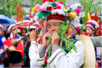 新娘的首飾主要由耳環(huán)、銀鐲、針筒銀鏈和戒指等構成,其中銀質手鐲和針筒銀鏈大都出自本地工匠之手。主要是因為在鶴慶以北的新華村早就是聞明世界的制銀之鄉(xiāng),銀手鐲一般分為“細絲”、“粗絲”和“粗夾細”三種。細絲就是用較細的銀絲(直徑0.1厘米)制作成直徑為l.5厘米的繩狀手鐲;粗絲則用0.2厘米銀絲做成;粗夾細是用上述兩種銀絲混合制做而成的。銀手鐲式樣的選擇取決于新娘的喜歡。而針筒銀鏈長40厘米,它是由l2條銀鏈排列組合,在銀鏈的中段有“石鎖”狀的飾物連接下部,銀鏈下端綴有栩栩如生的十二生肖屬相,針筒銀鏈掛在胸的左前側,但也有掛紅色或綠色方巾的,即實用,又能起裝飾作用。耳環(huán)、戒指和玉鐲等其它飾件一般由自己準備,但也有親友贈送的或是由婆家送的。整套服飾有容華貴,明快之中顯素雅,繡艷之中見端莊。