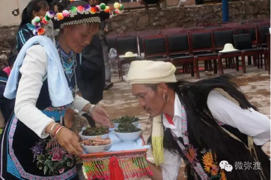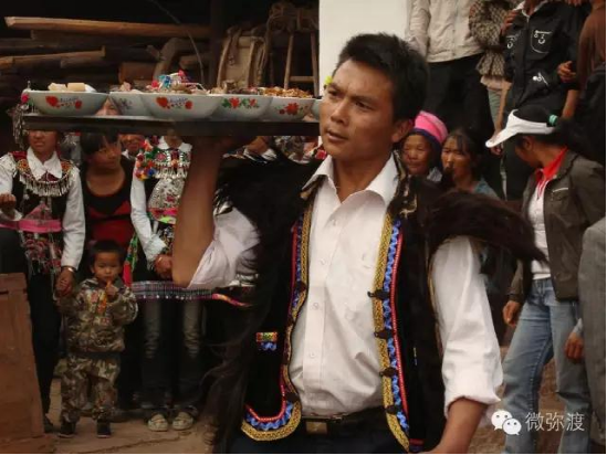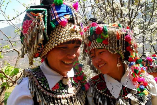 “羅羅潑支”男女服飾的特點(diǎn):“羅羅潑”男子服飾與“迷撒潑”相差無幾,一般不戴白頭巾。但是婦女的服飾相差卻很大,明顯保留著古樸高雅的南詔遺風(fēng)。頭飾由桂花、包頭、飄帶、大墜子、蜜蜂墜、芝麻鈴組成。桂花墊子在裱布上蒙黑色面料,中間訂有銀飾。包頭以黑色為主,長約2米,后鏈系于包頭,鏈子為銀制。飄帶長約4尺,黑色留花邊,兩頭訂英蘇。包頭還系有大墜子、蜜蜂墜各一對(duì),芝麻鈴20個(gè)。領(lǐng)合由裱布黑色面料上訂芝麻玲20個(gè)圍在脖子上。圍腰的前胸部,由領(lǐng)口至腹部,左右各垂掛一條綴有串珠、針筒、響篾(口弦)一類飾品和生活用品的銀質(zhì)項(xiàng)鏈。人一走動(dòng),全身的小蘇鈴就響,聲音悅耳動(dòng)聽,形象美觀大方。額頭前還圍有一塊翠綠色的“桂花綁”,綁上釘有銀質(zhì)小泡泡200多顆,羅羅潑支婦女的服飾彰顯華麗之美。