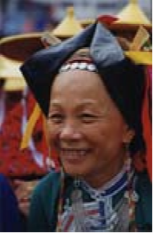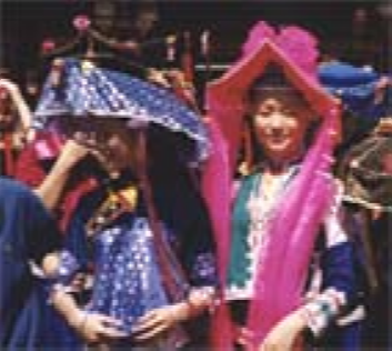惠東女結(jié)婚或出門做客等慶賀場(chǎng)合,頭飾突出一個(gè)“喜”字,講究鮮艷、豐采。梳大髻,插上各式各樣金銀飾品,間以各種式樣的絨花,打扮得猶如春意盎然的小花壇。同時(shí)用一條黑絲巾從髻邊向后與衣沿等長,巾的兩端再用黑帛接上,并以綠絲線縫制出各種花紋圖案。平時(shí)居家,頭飾則貫穿一個(gè)“簡”字,追求簡潔、實(shí)在,但絕不隨隨便便。她們往往插少許飾品和絨花,頭頂套一塊黑帛做面、里縫一層黑粗布拼湊的長方形罩,用三支竹子撐著,一半伸出前額,同時(shí)用黑帛做成羊角三角形豎于其上,尖端縫一道紅色織帶。住娘家(惠東婦女婚俗,婚后頭3天住夫家,此后長住娘家,直至生孩子后才回夫家定居)或守寡時(shí),恪守一個(gè)“淡”字。不梳髻,不插任何飾品,只把頭髻尾部卷起,一半包黑頭巾里、一半露在巾外、狀似一束面線,俗稱“褶職”。前者表示無拘束,后者強(qiáng)調(diào)守節(jié)。