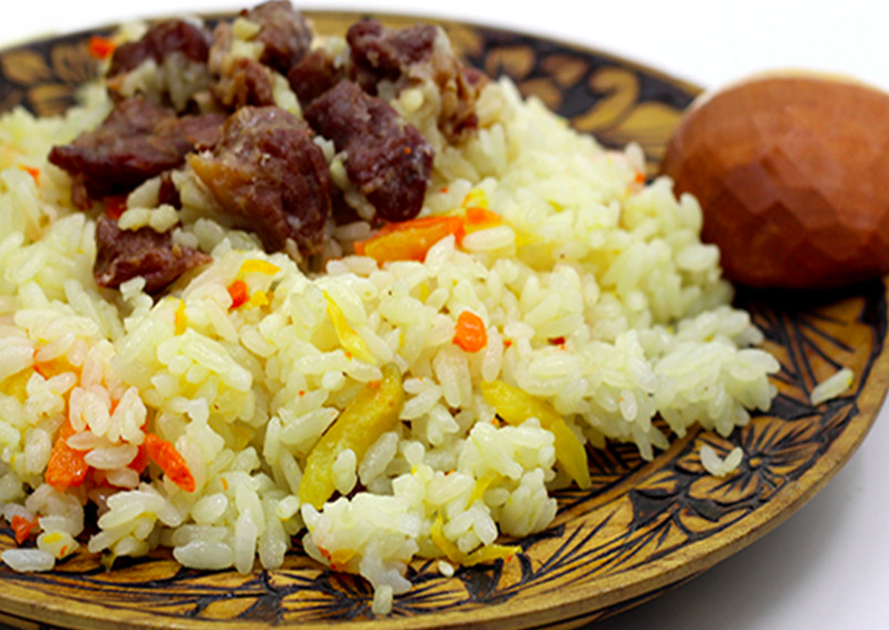羊肉抓飯是飯菜合一的飯食,因其油、肉多,熱量大,是維吾爾族人最愛吃的冬令美食之一。其制法是先將羊尾巴油燒熱出煙,再把切成核桃狀的羊肉放入,加鹽煸炒,然后加入切得很細(xì)的蔥、胡蘿卜絲、少許辣椒粉等炒勻,加湯、大米用小火燜熟,上面撒一些葡萄干、瓜條等,裝入盤中用手抓食。隨著各族人民的親密交往,抓飯已為漢、回等族人民所喜愛,制法也隨各自的口味不同而有所變化,如吃不慣羊油的,可用植物油,羊肉也可替換成牛肉。夏日無胡蘿卜,也可用西紅柿代替。食用時(shí)也可使用餐具而不用手抓。