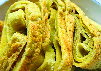 由于綠豆鍋巴的制作和原料有所不同,它的味道也不同。綠豆鍋巴粉在鍋內(nèi)烙成,呈四周薄中間稍厚,入鍋后,爐堂的松針毛毛噴噴火一燒,頓時(shí)鍋內(nèi)的鍋巴粉呈現(xiàn)出無數(shù)小氣泡,制成后切成條狀,切口有無數(shù)的小孔,像海綿狀,食用時(shí),入鹽、進(jìn)味、可口,硬香中顯現(xiàn)脆嫩,鹽香中蘊(yùn)含微甘。