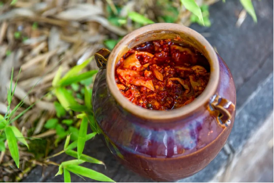 關(guān)于鶴慶的滋味,最深刻的記憶還要數(shù)那一小碟紅亮鮮香的豬肝胙。豬肝胙是用新鮮的內(nèi)臟、排骨佐以食鹽、花椒、辣椒、八角、草果等眾多香辛料研制而成的鶴慶特色美食。腌制好的豬肝胙,開壇即可聞到濃重的香氣撲鼻而來,蒸熟下飯,炒菜提鮮,豬肝胙濃郁的滋味都不會令人失望。