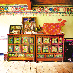 房屋大都是3層,上層存放干草和秸桿,下層關養(yǎng)牲畜,中間一層是居室。居室用木板隔間,里間較小是已婚子女住的,外間寬敞,是多功能堂屋。臨窗處設火塘,以利排煙,是家庭生活中心和待客之處?;鹛辽霞苤T大的鐵三角架,上面是六七厘米寬的鐵板圈,擦得錚亮,能烤制食物。墻角處供奉佛像,擺放領袖像。房門安設木鎖,用十幾厘米的木鑰匙開啟,都是由硬木刻制,光滑耐用。