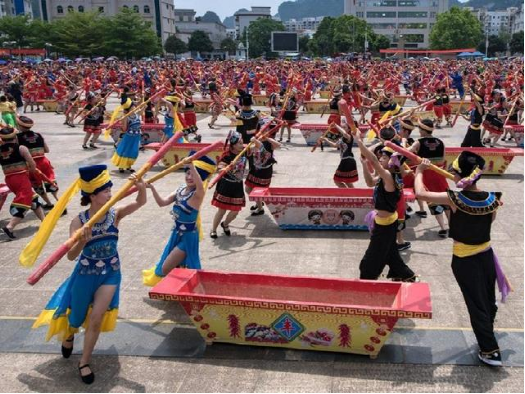 打榔舞,是崇左市天等縣的壯族傳統(tǒng)民俗舞蹈,用于酬神、還愿、祭祀、娛樂等活動(dòng),起源于唐代武德年間。打榔舞主要道具為木榔,音樂響起后,每人用一米多長(zhǎng)的木杵有節(jié)奏的敲擊榔壁、榔底和榔邊,動(dòng)作歡快有力,以此來表達(dá)壯族人民對(duì)五谷豐登、六畜興旺、幸福吉祥的祈求和渴望。表演者不分男女老少,有二人對(duì)打、四人對(duì)打、多人交錯(cuò)對(duì)打等多種方式。