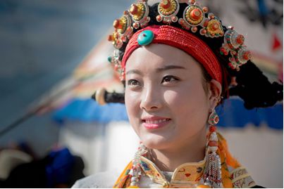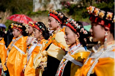 盤好發(fā)髻,佩戴好頭飾,在肩、背系好五彩哈達(dá)后,由本村具有威望的女性長者引領(lǐng)來到儀式現(xiàn)場(chǎng)。法號(hào)聲中,煨桑的青煙裊裊升起,威嚴(yán)的活佛主持誦經(jīng)祈福儀式。隨后,德高望重的長者為參加儀式的女子送祝福茶,長輩為姑娘們獻(xiàn)哈達(dá)。一系列儀式結(jié)束后,無論男女老少,都來到場(chǎng)地中央,踏歌起舞,跳起吉祥的鍋莊。