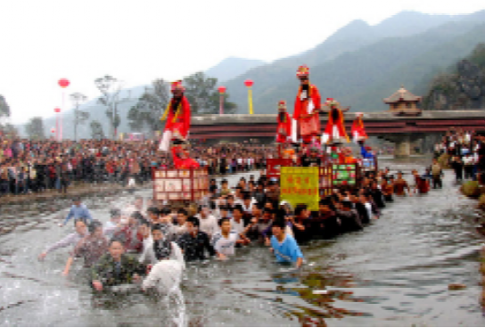 第二次是農(nóng)歷正月十五日上午,分上、下半闕。上半闕仍依十四日走法,至過午一時許,古事列隊(duì)從“方龍橋”下河床。鼓樂隊(duì)先互相潑水透濕,然后三響神銃,古事棚蜂擁下水,逆水而走。除天宮一棚不能超越外,后棚超前棚,則視為吉利。于是抬夫拼力而為,爭先恐后,不顧天寒水深、河石苔滑,跌倒了再爬起,情緒異常高昂,至下午三時許,一年一度的走古事才在高潮中落下帷幕。