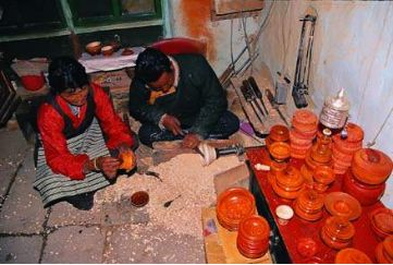 木碗的來源,一是西藏自己生產(chǎn)的,還有一種是云南迪慶生產(chǎn)的,都是從西藏的市場(chǎng)上交換或購買的。西藏林芝地區(qū)的朗縣、察隅,山南地區(qū)的加查、隆子、錯(cuò)那,阿里地區(qū)的噶爾等地均產(chǎn)木碗。其中尤以錯(cuò)那生產(chǎn)的“察牙”木碗和噶爾生產(chǎn)的“堆旭”木碗最負(fù)盛名。以上木碗的原料選擇樹根或樹瘤車制而成,選料之講究,做工之精細(xì),使好木碗的花紋各異,或磷火紋,或豬鬃紋,或貓頭鷹眼紋,這些木碗都很名貴,與普通木碗之間的價(jià)格也很懸殊,一個(gè)上等木碗價(jià)值10頭牦牛,一般人家是不敢問津的,但也盡量想方設(shè)法弄個(gè)像樣的,以慰平生。