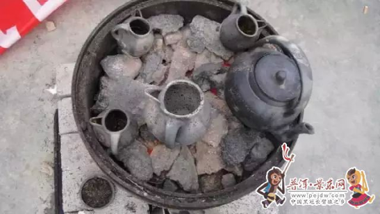 彝家糊米罐罐香茶烤罐要肚大口小,大小適中,茶具為土陶和紫砂制品為主。泡茶取無量山泉水,主要工序是用銅壺將水燒開,先將上好的糯米煎烤至黃,再將取于哀牢無量山的曬青白牙口茶放入抖烤。烤茶時(shí)要求“烤關(guān)百抖”,茶葉泛香糯米焦黃,糊米和茶葉烤好后,即沖入少量沸水,讓水自動(dòng)沖除罐口浮沫,放入小片刨開的鮮姜,再加入開水煮一分鐘,即可入杯,奉給客人飲用。