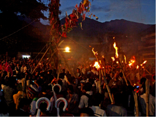白族視火為生命與靈魂的護佑物,古有火崇拜習俗,火把節(jié)是白族對“生之禮贊和死之緬懷的節(jié)日”。火把節(jié)這一天,各村由年內(nèi)新添子嗣之家作“會首”,在場壩中豎一高大的火把,常年扎十二臺,潤年扎十三臺,頂端扎升斗旗幟,上書“風調(diào)雨順”、“五谷豐登”字樣,下懸花紅、梨子、銅錢等物。天擦黑點燃火把,會首們以糖果、炒蠶豆、煙、茶、酒招待相聚在場壩中的老小。兒童則一手持小火炬,一手往火炬上撥灑松脂粉沐相戲,對新生的嬰兒表示致賀禮贊。與此同日,新亡故者之家人須上墳祭祀,在新故者墳前或大門口豎一小火把,如是者三年,表示對死者的緬懷,與史書“星回日祭祖”的記載相合。