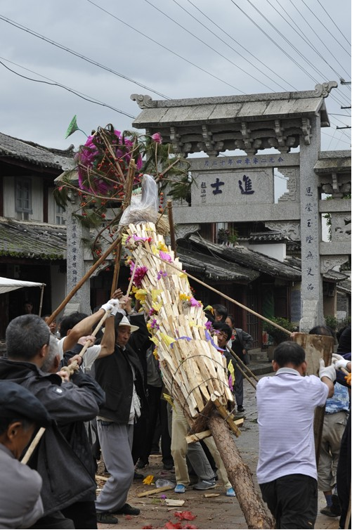 到了這一天,親友鄰居都不請自到來幫忙和祝賀。綁扎柴禾,做小彩旗,栓水果串等,等一切都好,再齊心合力豎起火把。等掛著果串的斗升一點(diǎn)點(diǎn)離開地面,火把樹穩(wěn)穩(wěn)當(dāng)當(dāng)挺立的時(shí)候,孩子的奶奶和外婆就在火把樹下燃起香,敬上茶酒和米干,虔誠地磕頭祈禱。